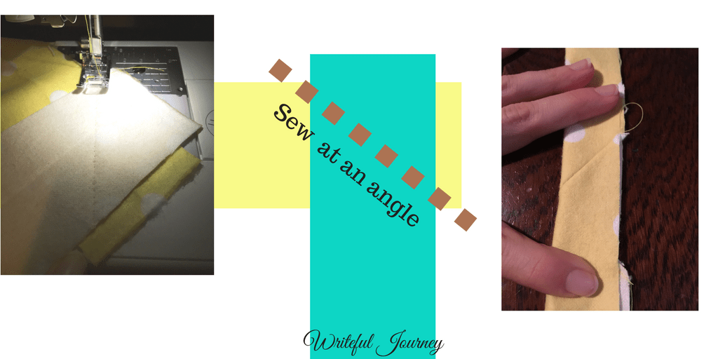- Sew strips together in a plus sign. Pattern should be facing each other. Sew at a diagonal. If you sew the strips end to end, it leaves a large bump and makes it very apparent where there is a seam. If you sew using the plus sign as demonstrated below, you get an angled seam that doesn’t bunch the material.